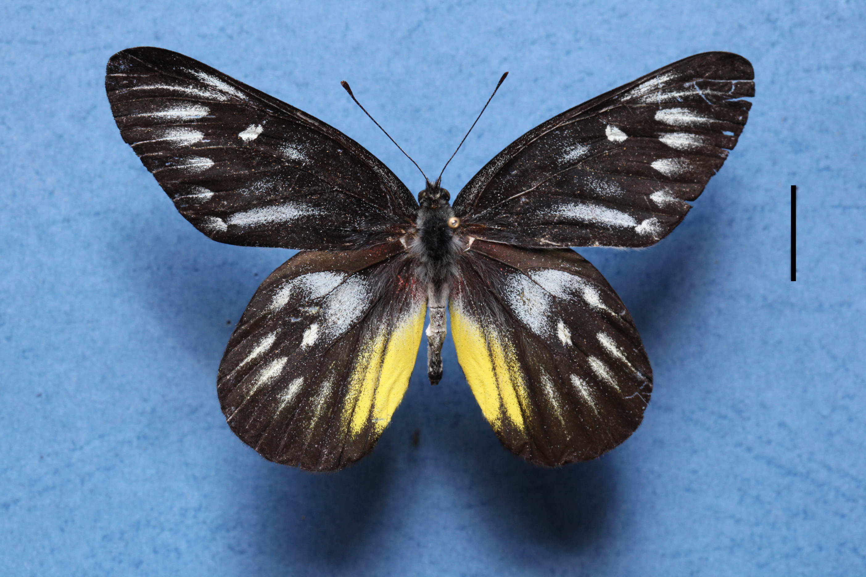 成虫:成虫翅展89.89~70.02mm,身体背面灰黑色,腹部灰白色。前翅正面灰黑色或黑色,正面中域翅室有一列界限模糊的灰白色长卵形斑,亚外缘有一列灰白小斑纹;反面的纹理跟正面基本一致。后翅正面翅基红色,中域灰白色,被黑色翅脉分割;外缘黑色,散布有白点;内缘臀区黄色。后翅反面翅基部红色,中域至亚外缘多个大型黄斑;