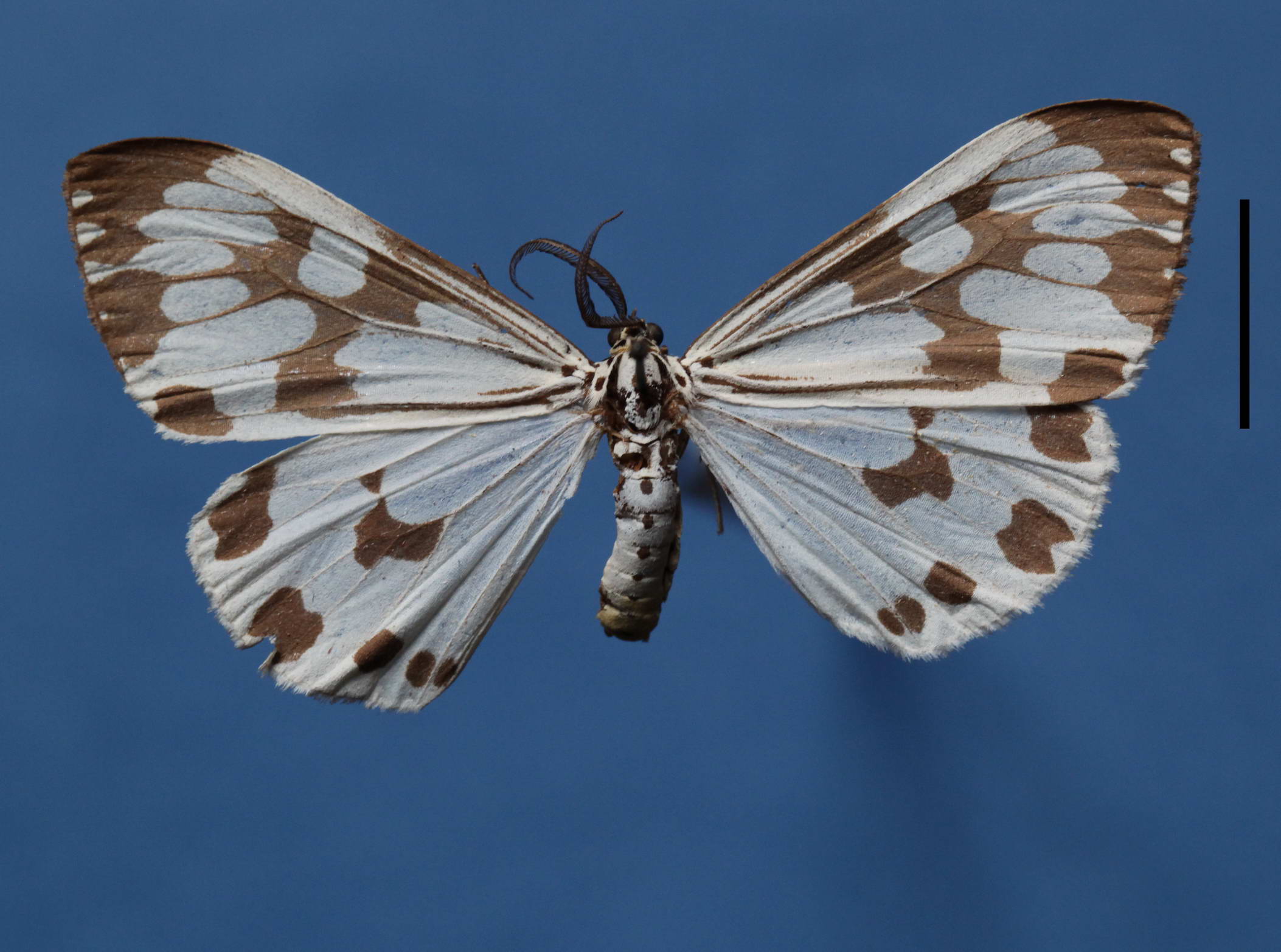 成虫:翅展44~56mm。头黄色,颈板黄色,额、头顶、颈板、肩角、胸部各节具一黑点,翅基片具黑点 2个;腹部白色、末端黄色,背面、侧面具黑点列;前翅白色,翅脉暗褐色,中室中部有一暗褐色横纹,中室端部有一暗褐色斑,Cu2脉基部至后缘上方有暗褐纹,Sc脉末端起至Cu2脉之间为暗褐色斑,臀角上方有一暗褐斑,臀角上方至翅顶缘毛暗褐色;后翅白色,中室下角处有一暗褐斑,亚端线暗褐斑纹4~5个。