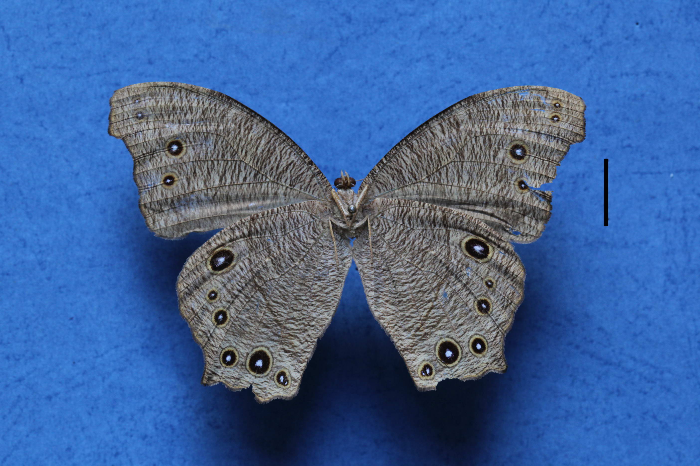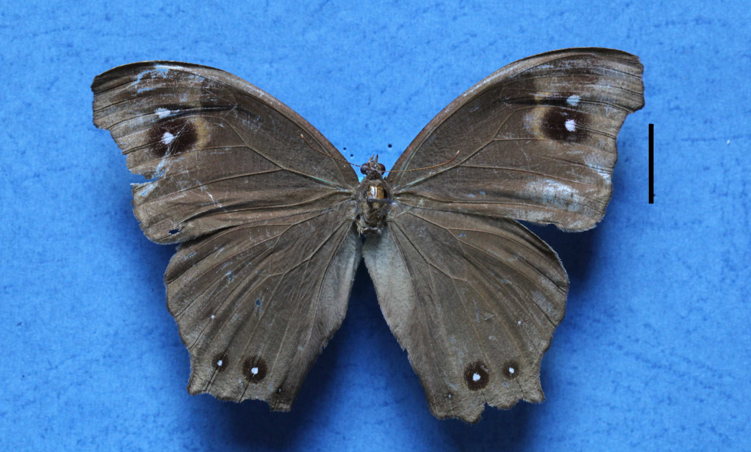 成虫:该蝶有春、夏型之分。春型翅反面斑纹消失,仅留少数小点,夏型黑色眼状斑清晰。前翅正面除cu1有一个大眼斑外,近顶角小眼斑不见。雌蝶翅面黑褐色,前、后翅二条外缘线清晰,前翅有一个眼状斑。翅反面二条外缘线清晰,前翅有二个眼状斑,后翅有大小不等的七个眼状斑,中横线黄色。雄蝶前翅反面2A脉上性斑宽大,色较深,而后翅面性斑细毛,具黄色长毛束。