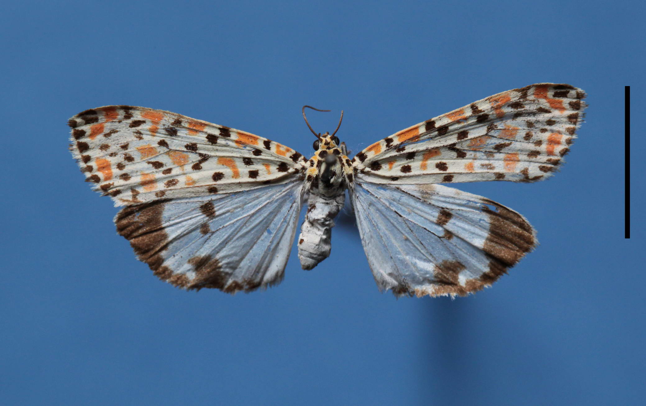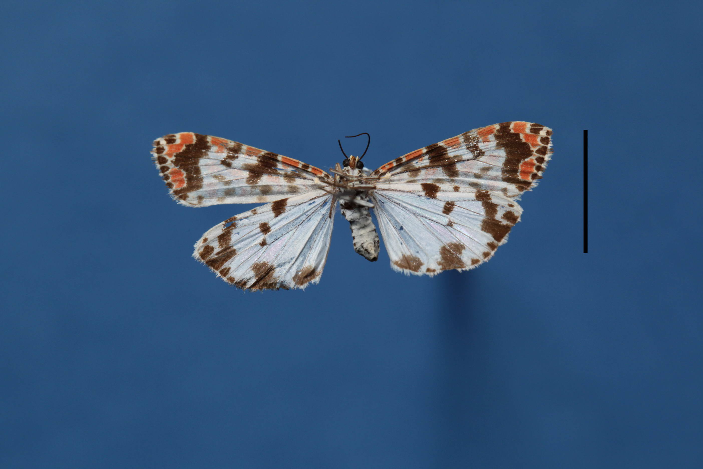 成虫:展翅宽32~40mm。上翅表面散生许多红色与黑色相互交错分布的小斑纹;下翅外缘与中室端具黑色斑。本属台湾有另一近似种,本种的鉴定特征是前、中胸背侧各有1枚独立不相连的黑点;上翅前缘中央红斑不呈长条形,深达中室。