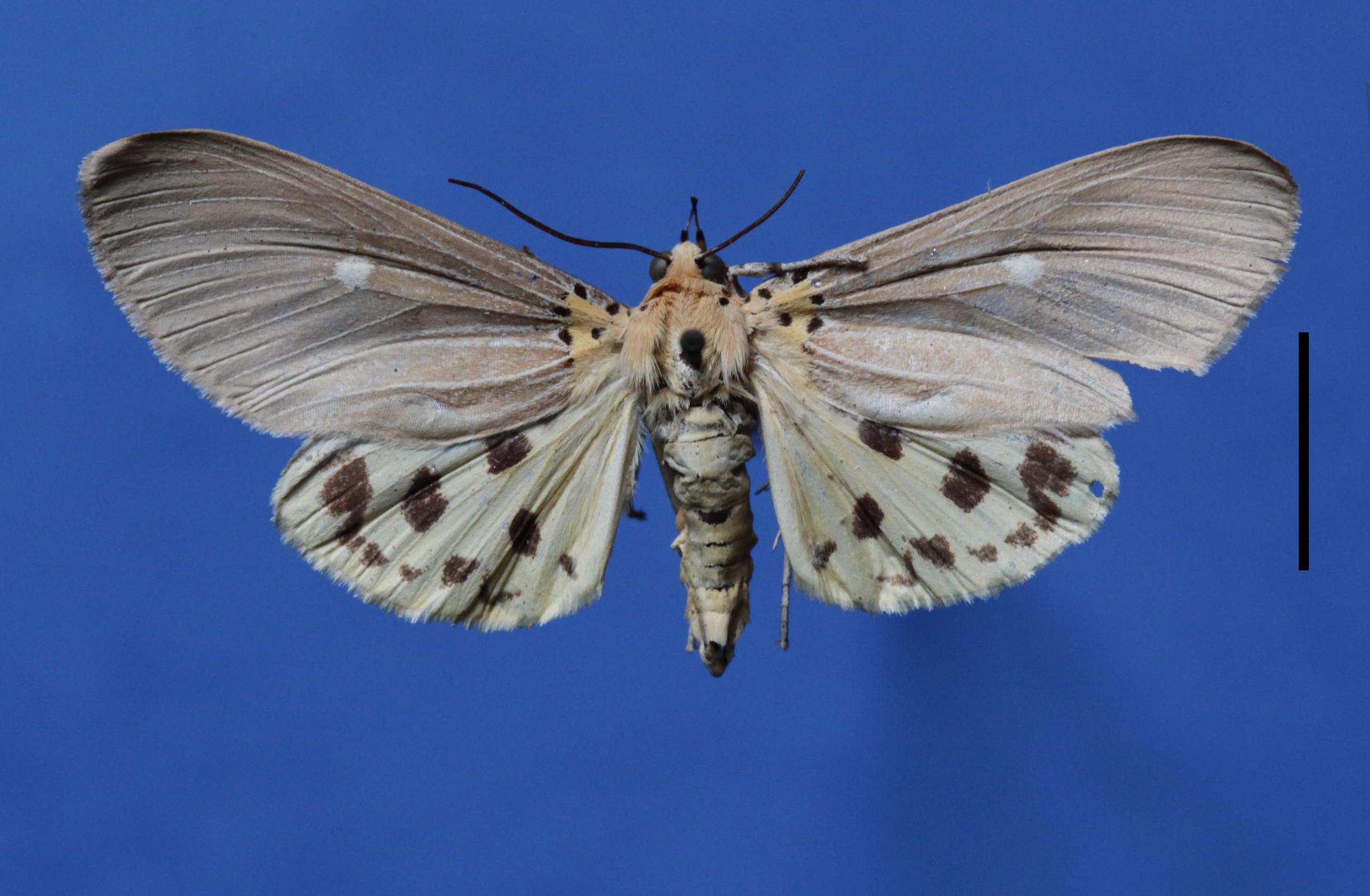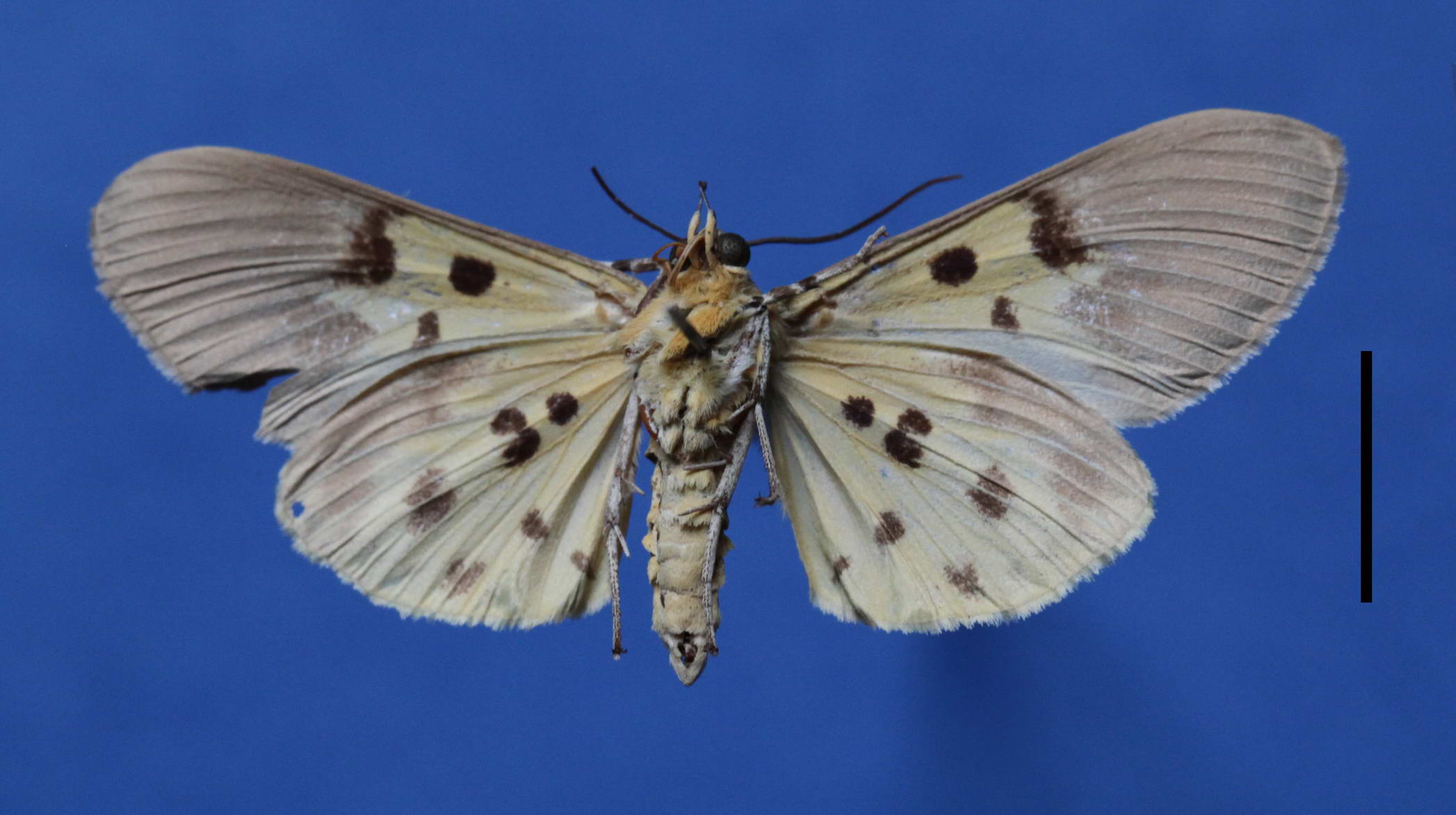 成虫:体长雌18~27mm,雄16~17mm,前翅长雌27.5~31.0mm,雄24.5~27.0mm。头、胸、腹部橙黄色;翅基片与后胸具黑点;触角黑褐色,下唇须第1~2节基部侧面各具黑点1个,第3节雌蛾为黑色,雄蛾为褐色,端部色淡;前翅灰褐色,基部橙黄色、上有黑点5个,中室下角有一白点,翅脉白色;后翅橙黄,中室端具黑斑,外线有2个黑斑,亚端线有或无黑斑;领片近前端有黑斑1个,足灰黄白色,腿节和胫节端黑色,前腿节背面和内侧及中足胫节背面鳞毛黑褐色。腹部背面有黑斑1~4个,雄蛾黑斑多半只有1个,在第4腹节背面。雌蛾腹部末端有灰黄褐色毛刷;
